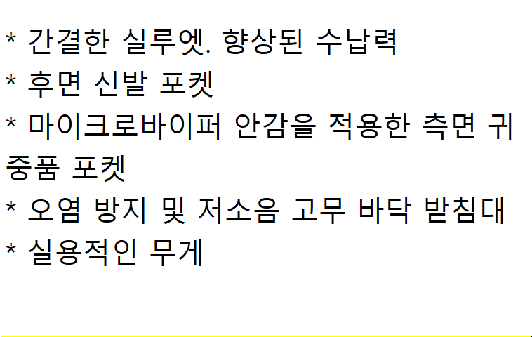특판 대량물량 협의 - 문의 쿠독 - * 간결한 실루엣. 향상된 수납력 * 후면 신발 포켓 * 마이크로바이퍼 안감을 적용한 측면 귀중품 포켓 * 오염 방지 및 저소음 고무 바닥 받침대 * 실용적인 무게