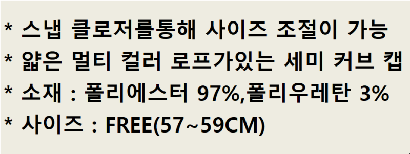 대량물량협의 - 문의 쿠독 - * 스냅 클로저를통해 사이즈 조절이 가능 * 얇은 멀티 컬러 로프가있는 세미 커브 캡 * 소재 : 폴리에스터 97%,폴리우레탄 3% * 사이즈 : FREE(57~59CM)