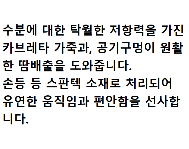 특판 및 대량문의 - 쿠독 - 가능호수 22 23 24 수분에 대한 탁월한 저항력을 가진 카브레타 가죽과, 공기구멍이 원활한 땀배출을 도와줍니다.