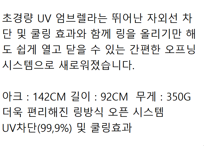 9개 한박스 정품케이스 대량 특판 협의 - 문의 쿠독 - 초경량 UV 엄브렐라는 뛰어난 자외선 차단 및 쿨링 효과와 함께 링을 올리기만 해도 쉽게 열고 닫을 수 있는 간편한 오프닝 시스템으로 새로워졌습니다.