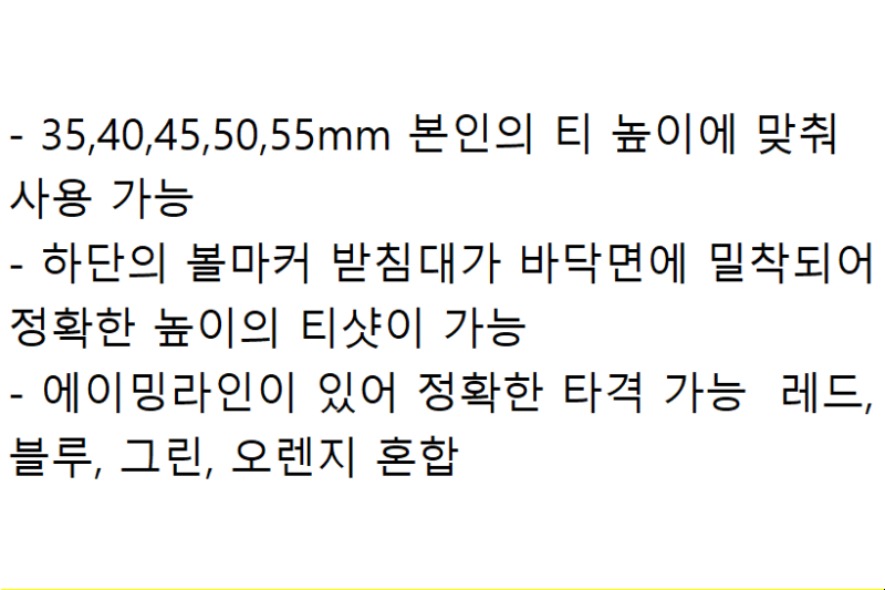 특판 대량 문의 - 협의 쿠독 - '- 35,40,45,50,55mm 본인의 티 높이에 맞춰 사용 가능 - 하단의 볼마커 받침대가 바닥면에 밀착되어 정확한 높이의 티샷이 가능 - 에이밍라인이 있어 정확한 타격 가능