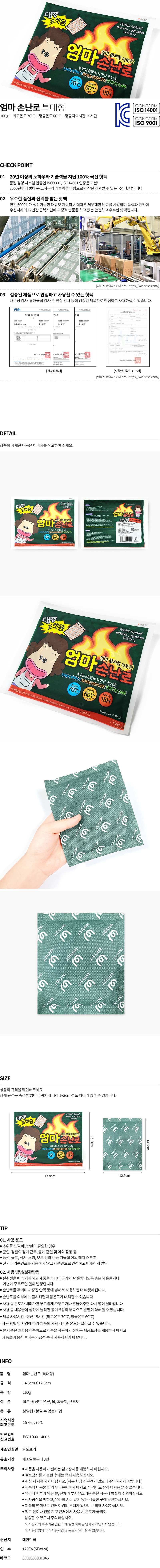 원산지 한국 참고사항 최고온도 70℃,최대지속시간 15시간 원료 철분,활성탄,염류,물,흡습제,규조토 BARCODE 8809333901945