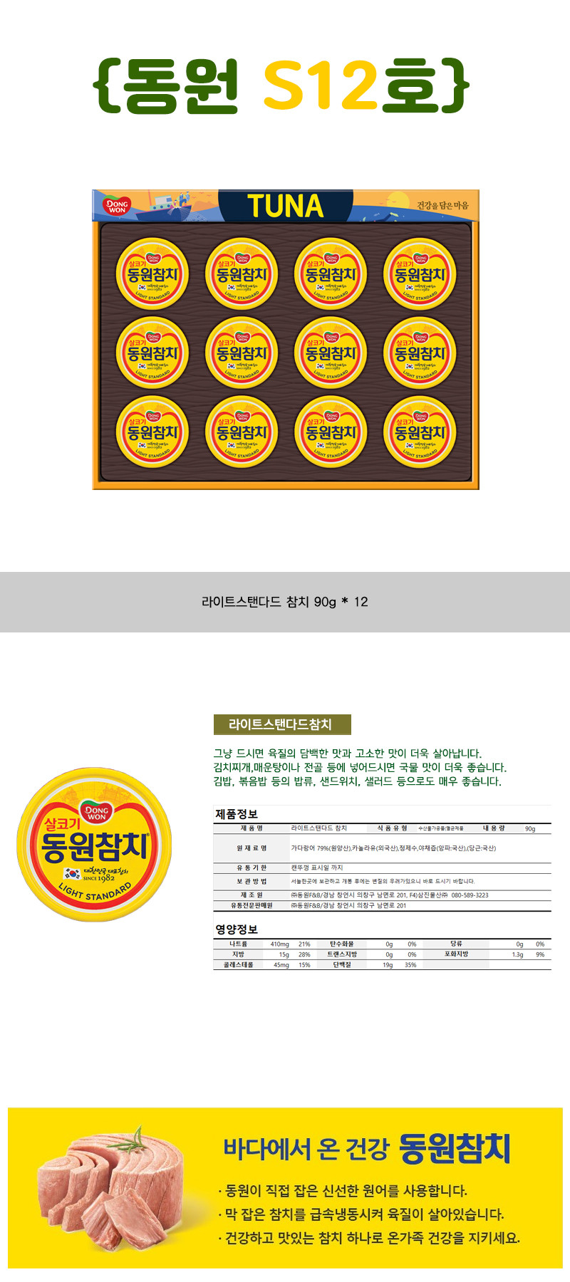 제조사 : 동원 구성 : 동원 쿡참치 85g x 10, 리챔 오리지널 120g x 4 포장 : 상하판케이스, 쇼핑백동봉