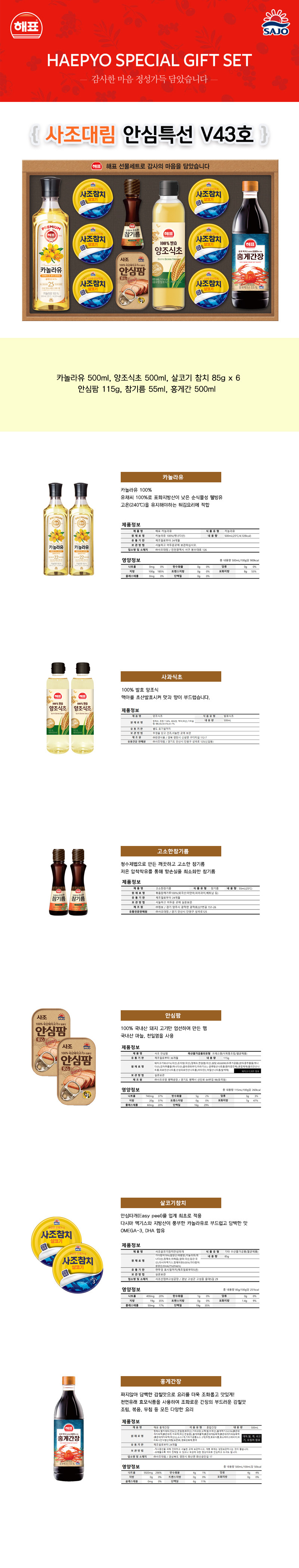 제조사 : 사조대림 구성 : 카놀라유500ml x 1, 사조 살코기참치85g x 6, 고소한참기름55ml x 1, 안심팜115g x 1, 양조식초500ml x 1, 홍게간장500ml x 1 포장 : 상하판케이스, 부직포가방