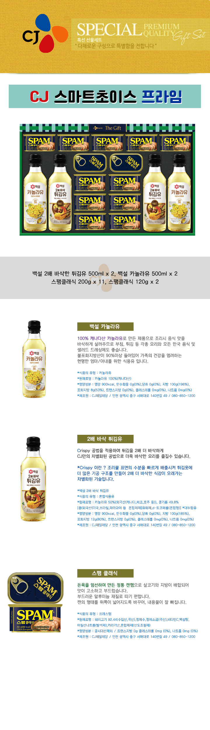 제조사 : CJ 구성 : 백설 2배 바삭한 튀김유 500ml x 2, 백설 카놀라유 500ml x 2, 스팸클래식 200g x 11, 스팸클래식 120g x 2 포장 : 상하판케이스 / 부직포가방