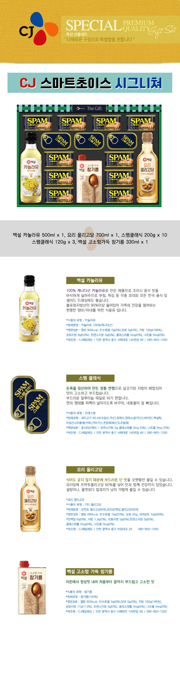 제조사 : CJ 구성 : 백설 카놀라유 500ml x 1, 요리 올리고당 700ml x 1, 스팸클래식 200g x 10, 스팸클래식 120g x 3, 백설 고소함가득 참기름 330ml x 1 포장 : 상하판케이스 / 부직포가방