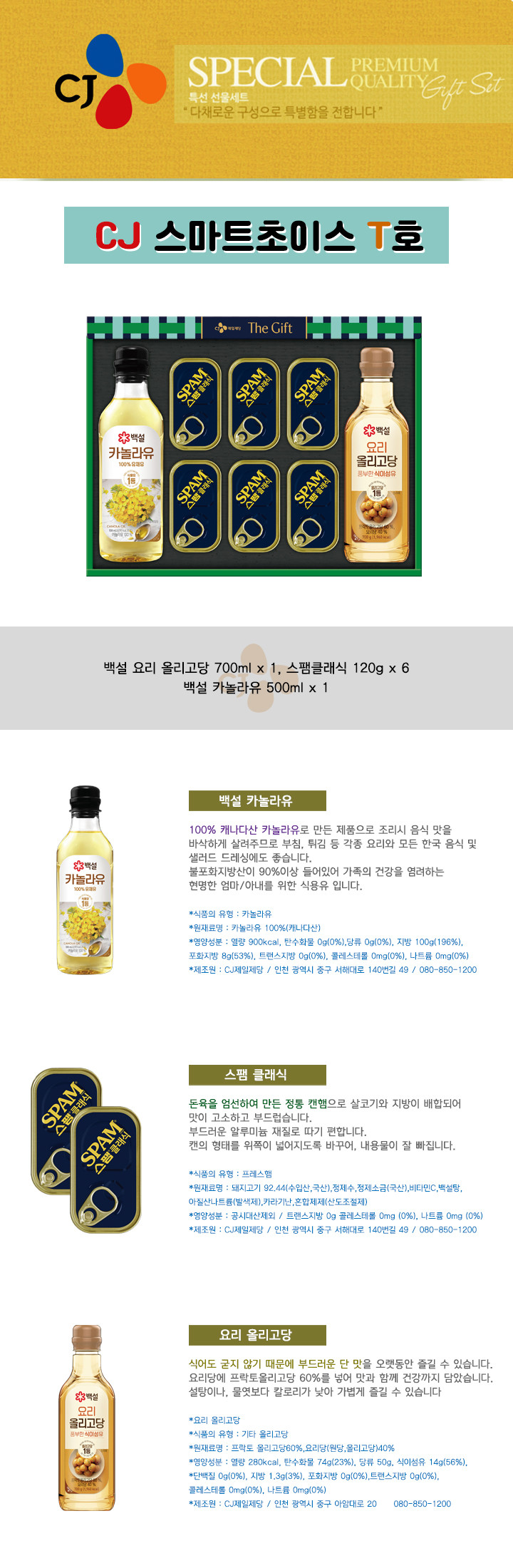 구성 : 백설 요리 올리고당 700ml x 1, 스팸클래식 120g x 6, 백설 카놀라유 500ml x 1