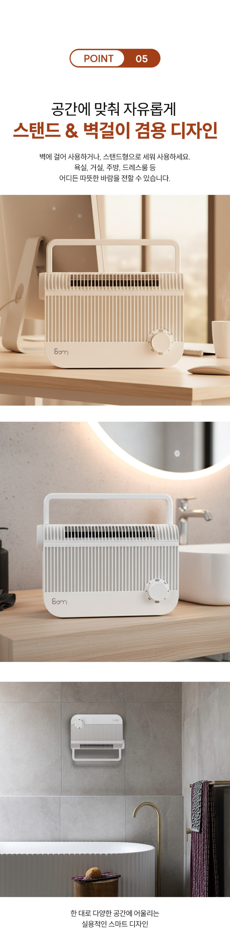 * 무타공 간편 설치, 순간 발열 욕실 온풍기 *약 345 x 305 x 170 mm / 약 1.9KG * 발열방식 : PTC 히터 / * 방수등급 : IPX 4 * 정격전압 : 220V, 60Hz * 소비전력 : 송풍 10W, 온풍1단 750W, 온풍2단 1500W * 재질 : PP 외 * 코드선 길이 : 1.5m * 송풍구 최고 온도 : 155도