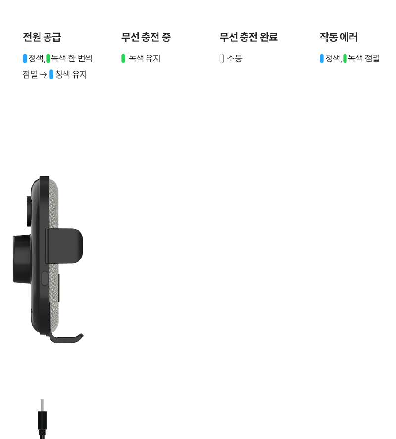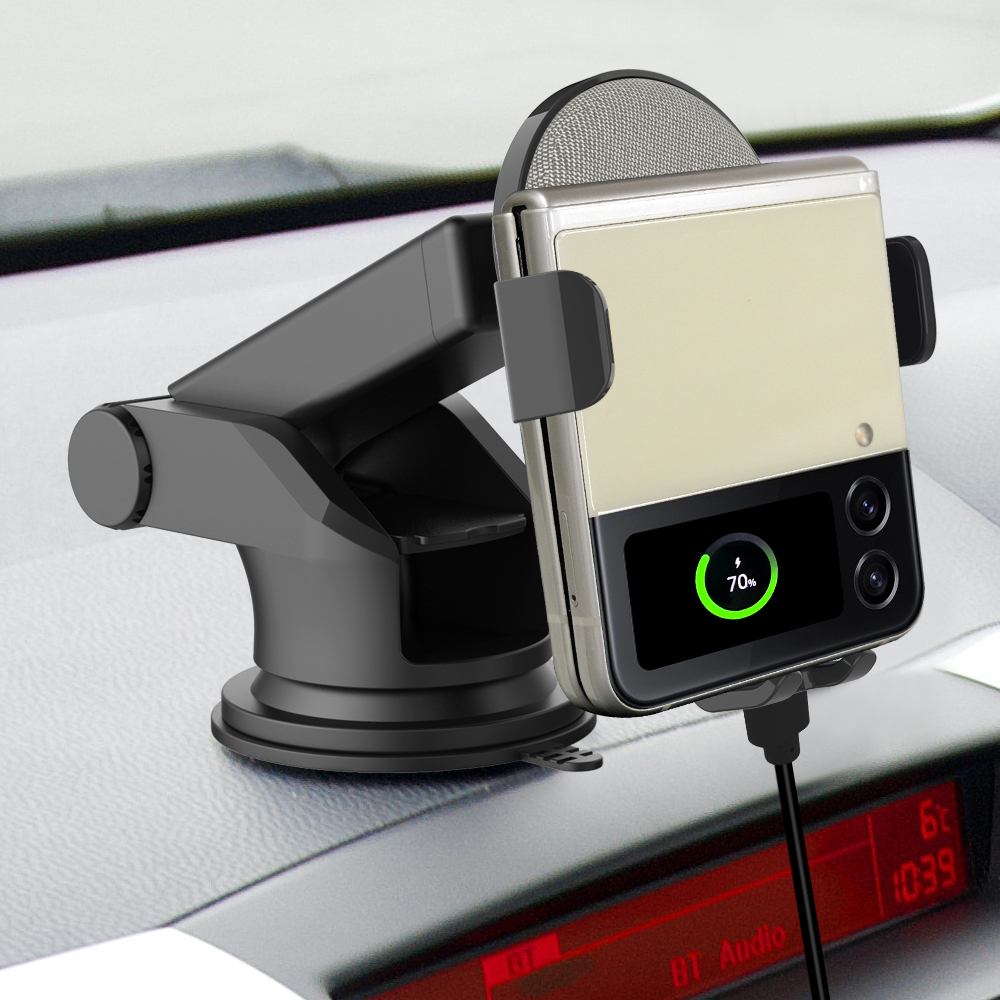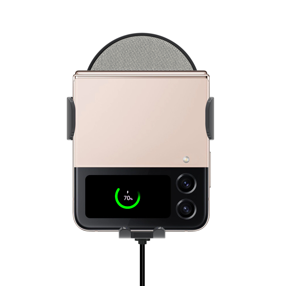듀얼 코일 장착으로 갤럭시 z플립, 폴드 , 스마트폰 모든 휴대폰을 거치하며 충전하는 제품 - 최대 15W 속도의 초고속 무선충전 가능. - 거치부 좌측 우측 버튼을 터치하여 클립을 개폐함 - 컨덴서(배터리 역할)가 내장되어 시동이 꺼져도 1분간 전원유지 - 차량용 충전기 부터 충전케이블 거치대 까지 이거 하나로 모든것이 완벽한 구성의 풀패키지