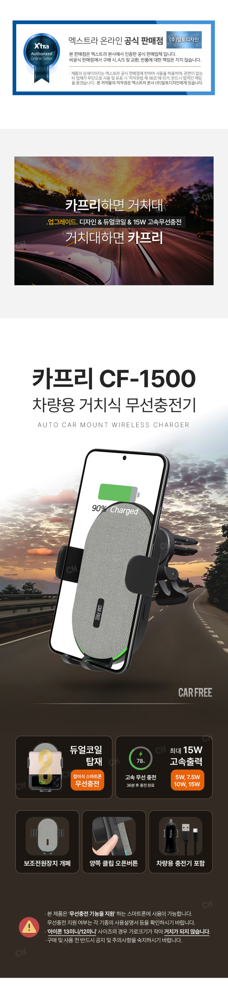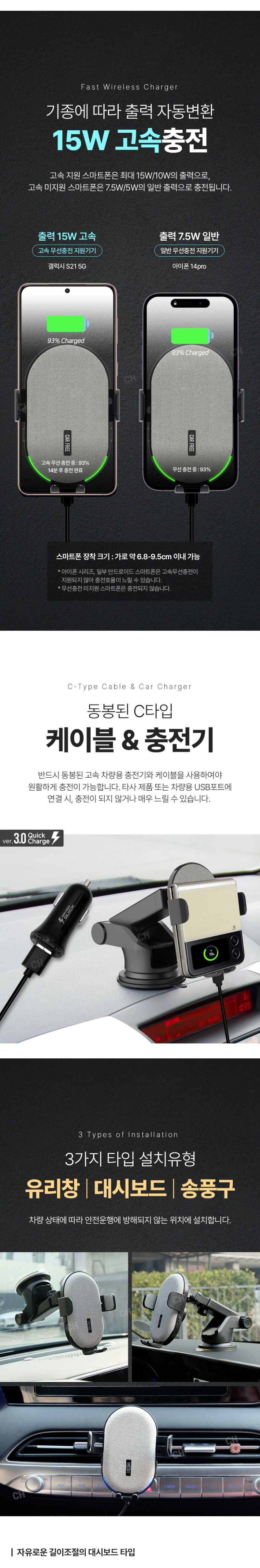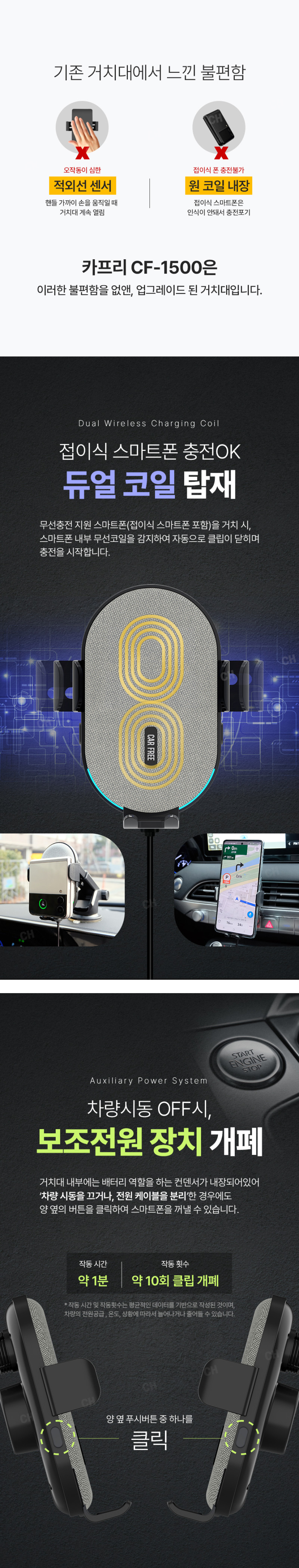 듀얼 코일 장착으로 갤럭시 z플립, 폴드 , 스마트폰 모든 휴대폰을 거치하며 충전하는 제품 - 최대 15W 속도의 초고속 무선충전 가능. - 거치부 좌측 우측 버튼을 터치하여 클립을 개폐함 - 컨덴서(배터리 역할)가 내장되어 시동이 꺼져도 1분간 전원유지 - 차량용 충전기 부터 충전케이블 거치대 까지 이거 하나로 모든것이 완벽한 구성의 풀패키지